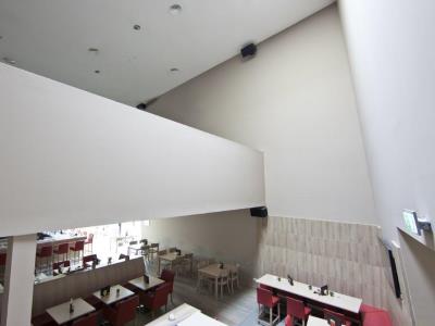 Pannello acustico in lana di roccia (30 mm) rivestito con un velo verniciato in bianco sulla faccia a vista e con una membrane ad alte prestazioni sulla faccia superiore. I pannelli vengono fissati meccanicamente alla struttura, per poi essere trattati con uno stucco speciale coprigiunti e e uno stucco di finitura (bianco o colorato).