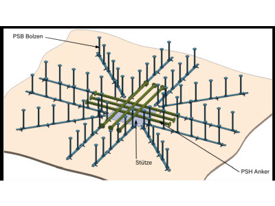 Les armatures anti-poinçonnement sont principalement utilisées dans des planchers-dalles où des charges importantes, par ex. des piliers ou des murs, sont prévues dans des zones d’appui. Des moments de flexion importants avec des forces transversales élevées se superposent dans la zone d’appui. Un poinçonnement du plancher peut donc se produire en raison de contraintes de cisaillement élevées. La résistance au poinçonnement et la capacité