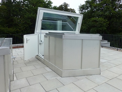 Die grosszügigen Abmessungen ermöglichen eine normale Geschosstreppe als Aufgang. Abschlussdeckel sind mit einer Verbundsicherheitsglaseinlage und verschiedenen Abdeckblechen