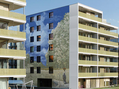 241.114 Fassaden Sichtbeton roh;deck. Ausführungsart Flächen Silicatfarbe (2-Komponenten-Mineralfarbe), PG 453. |