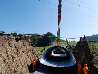 Strassen-, Bahn-, Fussgänger- und Bachunterführungen sowie Schächte und Silos müssen enormen Belastungen standhalten. Die Wellstahlprofile von der Arthur Weber AG eignen sich hervorragend für diese anspruchsvollen Anwendungen. Die Kombination aus miteinander verschraubten, gewellten und verzinkten Stahlsegmenten und dem umgebenden, verdichteten Erdreich verleihen der Konstruktion grosse Stabilität. Die Strukturen werden meist vor Ort durch erfahrene Monteure in kürzester Zeit zusammengebaut. Unmittelbar nach dem Einbau und der Hinterfüllung können die Strukturen