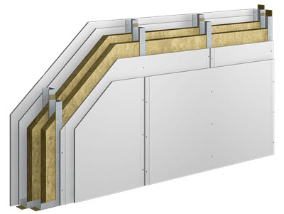 215.000 Ständerwände. Doppeltes Ständerwerk aus Metall. Beplankung beidseitig je 2 Lagen Gipsplatten. |