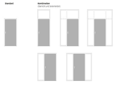 - ein feststehendes Seitenteil auf Türhöhe und ein feststehendes durchgehendes Oberlicht, über Türblatt und Seitenteil verlaufend